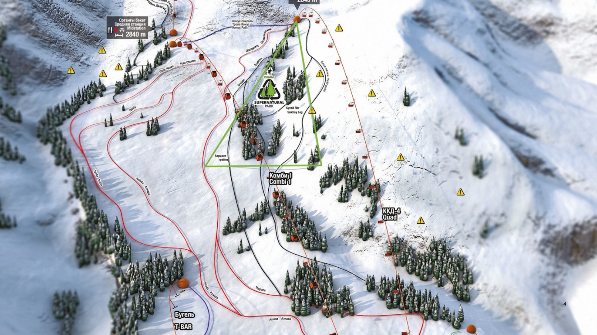 Na nejvyšší část areálu vedle sjezdovek — lanovka nás vyveze až nad 3 000 m n. m., se nachází Talgar Pass Station, odkud startují nejvrcholnější sjezdovky.