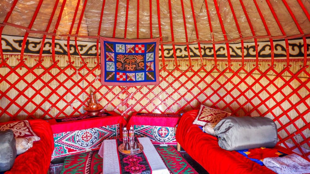 Ve městech – tj. v Biškeku, Karakolu a Oši, budeme ubytovaní v pohodlných hotelech v dvoulůžkových pokojích, vždy s privátní koupelnou s teplou vodou, klimatizací a wi-fi. V horských venkovských oblastech budeme spát v útulných rodinných penzionech a 2-3 noci strávíme v tradičních jurtách, každá pro cca 6 lidí, někde bude k dispozici teplá voda, někde ne.
