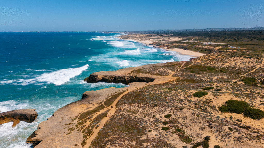 Almograve: Je klidná portugalská vesnička, která ti nabídne čistý oceánský vzduch, široké písečné pláže a atmosféru, kde se čas zpomaluje. Je ideálním místem pro odpočinek po náročnějším dni na trailu — ráno tu můžeš pozorovat rybáře při práci, odpoledne se projít po útesech a večer si vychutnat západ slunce v naprostém tichu. Nenápadná, ale o to působivější zastávka na cestě.