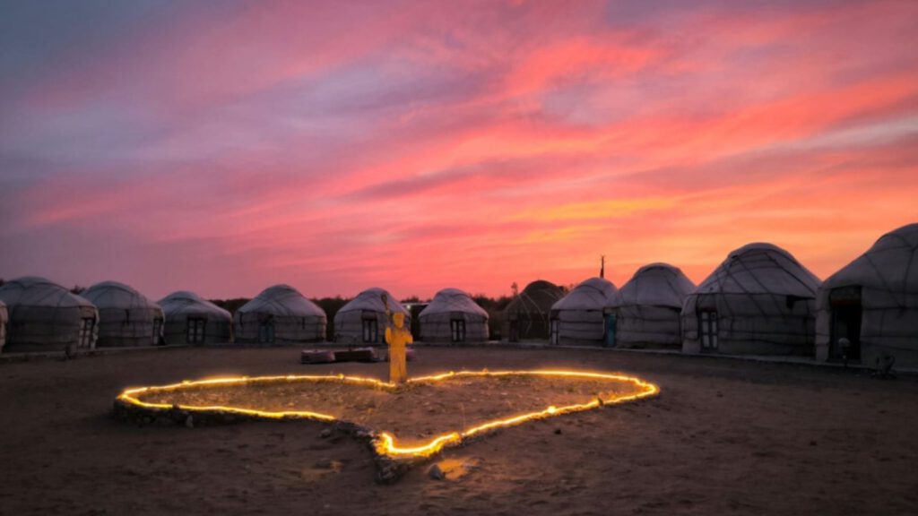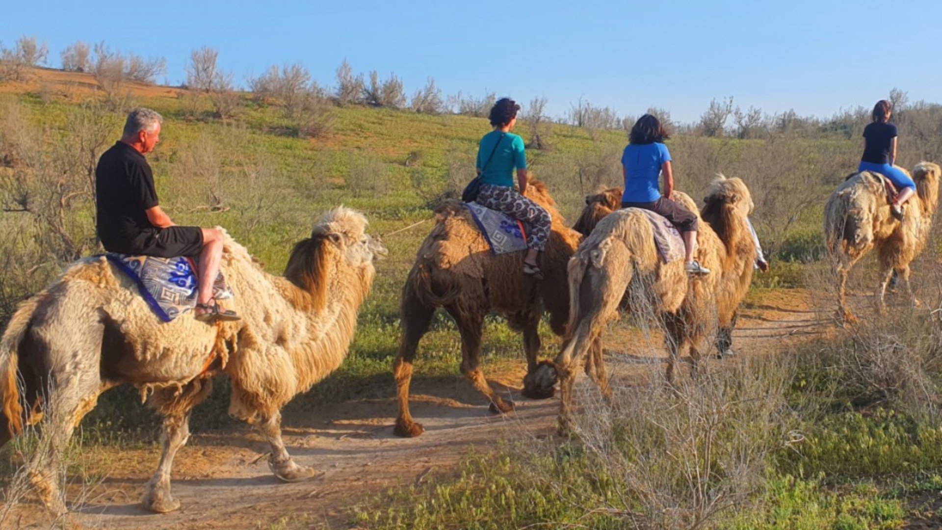 Po snídani se vydáváme na dobrodružnou cestu na sever směrem k rozlehlé poušti Kyzylkum. Cestou se zastavíme v malebném údolí u petroglyfů Sarmyš, nejvýznamnějšího archeologického naleziště petroglyfů v zemi, jejichž původ sahá až do dob neolitu. Obdivovat zde budeme tisíce rytin na kamenech, které vyprávějí příběhy dávných civilizací. Odpoledne dorazíme do srdce pouště, do jurtového tábora etnických Kazachů. Zde nás čeká romantická projížďka na velbloudech při západu slunce, kdy si budeme moci vychutnat klid a ticho nekonečné pouště. Večer nás pohostí tradiční večeří složenou z různých druhů masa – skopového, kozího a možná i velbloudího. Po večeři posedíme u ohně pod širým nebem, kde budeme moci pozorovat noční oblohu plnou hvězd. Noc strávíme v pohodlí tradičních jurt, obklopeni tichem pouště, daleko od civilizace.